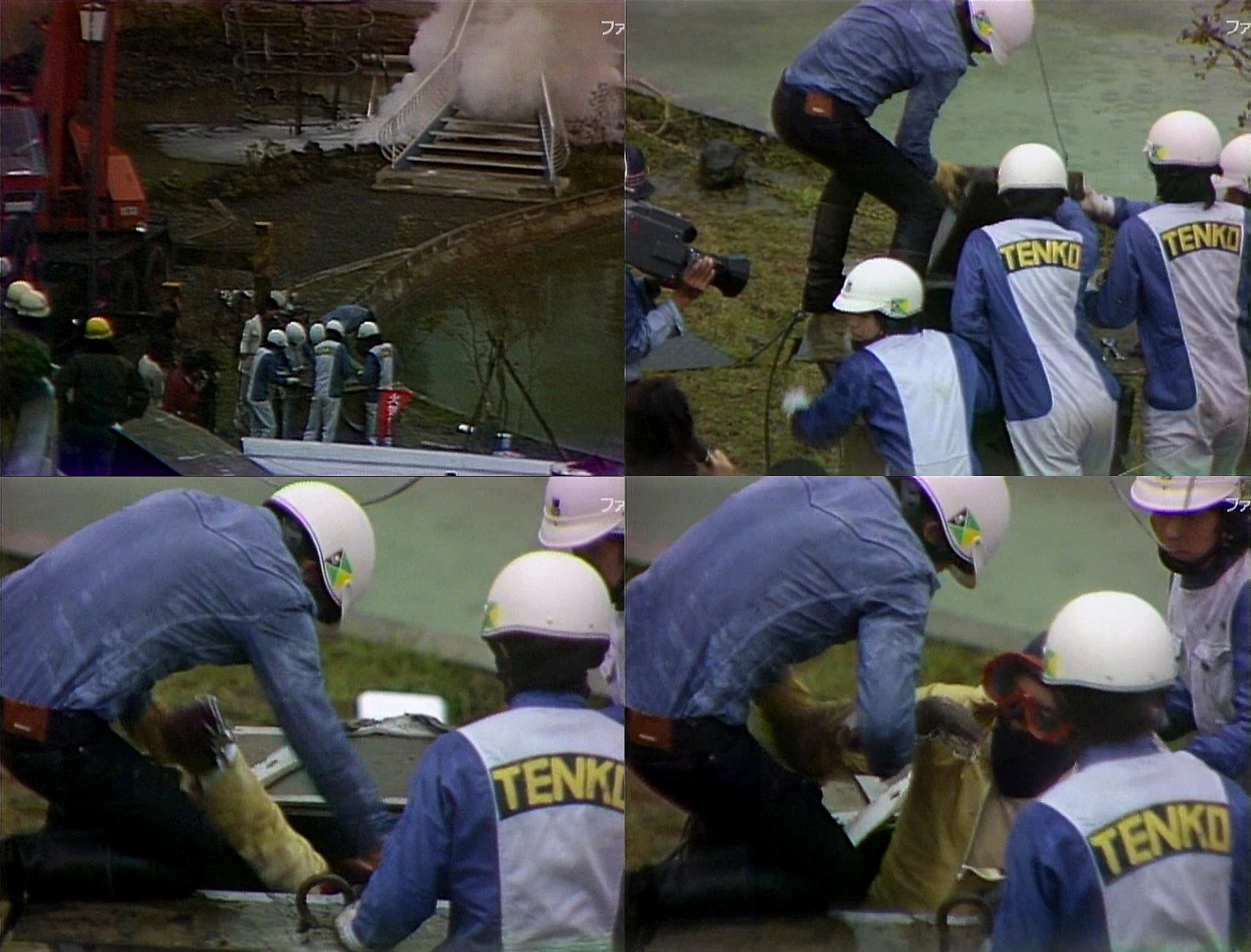 ここで立ち上がったのがチームTENKOのスタッフ連中。 危険を顧みず熟練したクレーン捌きで脱出壺に到達したスタッフは、かすかな望みが託された脱出カプセルを水中から搬出します。